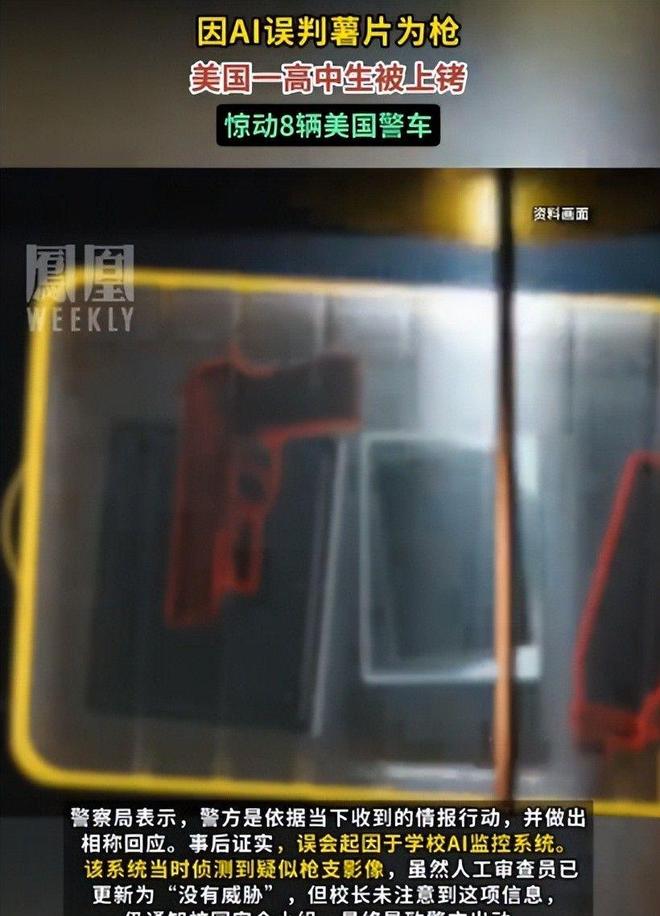 据艾伦事后回忆,那一刻他大脑一片空白,完全无法理解为何自己会成为执法目标。警方在现场进行了全面搜查,结果却尴尬至极——不仅没有发现任何,甚至连刀具或尖锐物品都未找到。最终他们拿出监控截图比对才发现,原来是AI识别系统把艾伦口袋里鼓起的、皱缩成团的薯片包装袋误判为一把手枪。