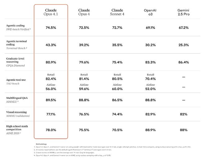 在Anthropic的官宣博客中提到,新模型在智能体工具调用与多语言问答能力上超越OpenAI o3,在智能体编程方面的分数为74.5%和43.3%,大幅超越OpenAI o3和Gemini 2.5 Pro,但其在视觉推理和数学能力上与OpenAI o3和Gemini 2.5 Pro还有一定的差距。
